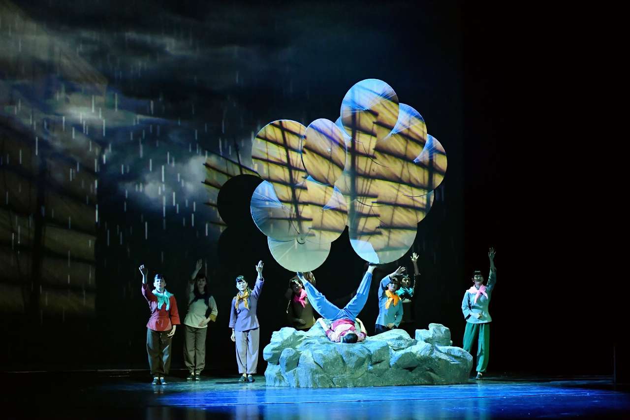 舞台上,伴随嘹亮的号子声,小演员扮演的黑尾鸥立于8米长的摇橹之上,体现着渔民们搏击深蓝的壮志豪情。巨浪投影与演员的腾空飞杠技巧无缝衔接,再现海难吞噬渔船的惊心动魄。渔家姑娘脚蹬15把油纸伞寓意远航风帆,送别出海丈夫,演绎生死离别的凄美。斑海豹“偷鱼”桥段中,小演员们的技巧表演充满萌趣,真人演员模拟翻腾的大黄鱼效果逼真,蹦床演绎的养殖网箱则充满创意地表现出智慧渔业的振兴发展。当全球首艘10万吨级养殖工船“深蓝回声号”从海洋深处缓缓驶来,全场观众爆发热烈掌声。